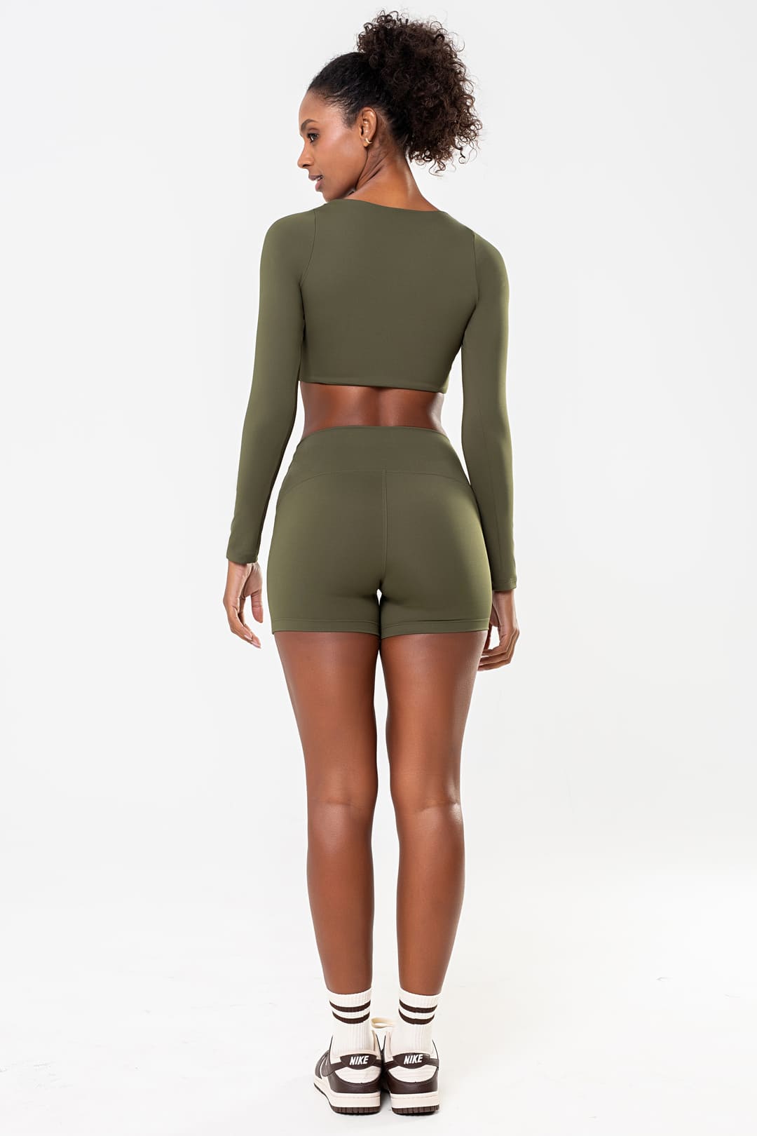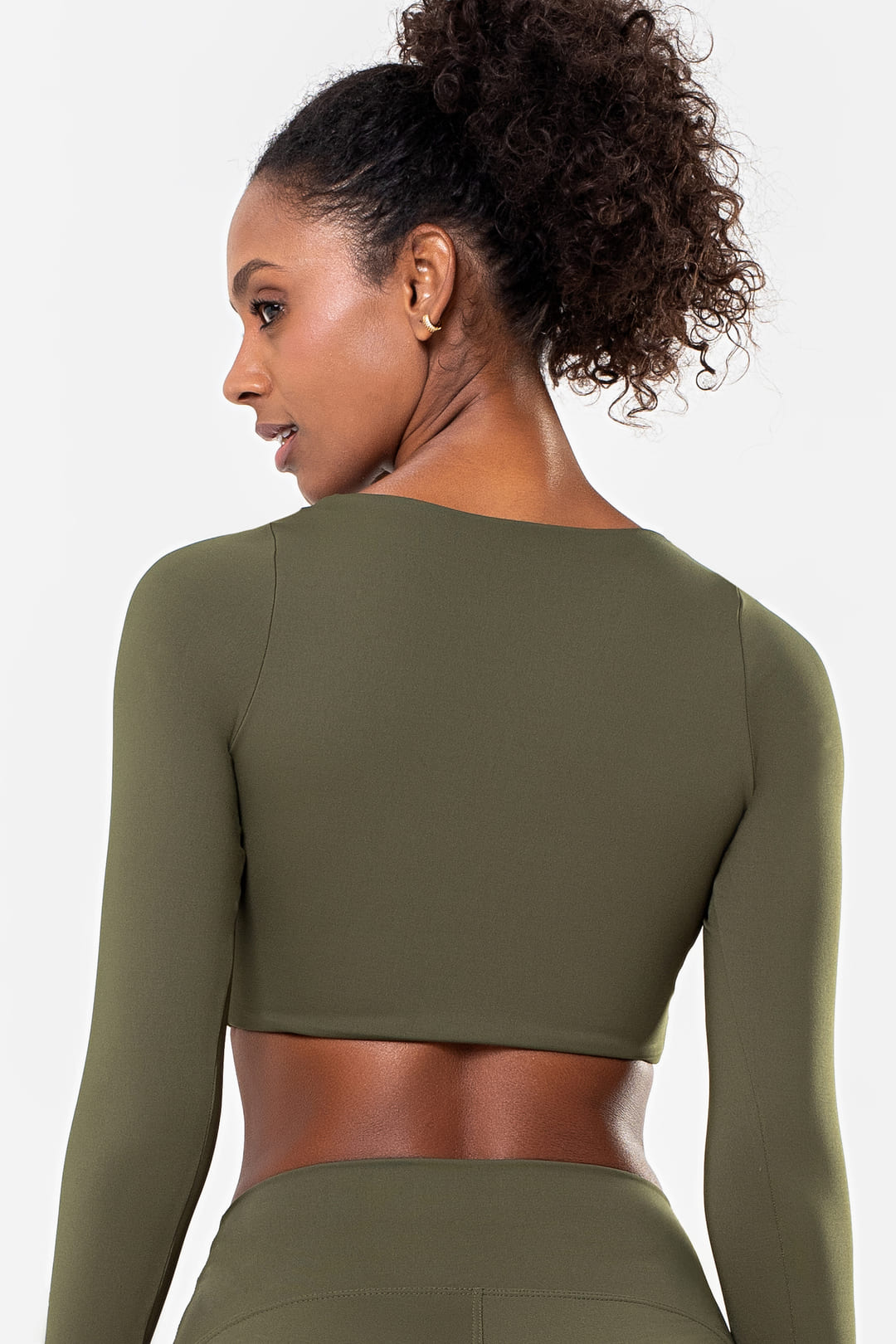 o Cropped de poliamida na sua tonalidade verde terroso evoca conexão com a natureza e serenidade ao vestir — ideal para acompanhar tanto momentos de movimento quanto pausas ao entardecer.
