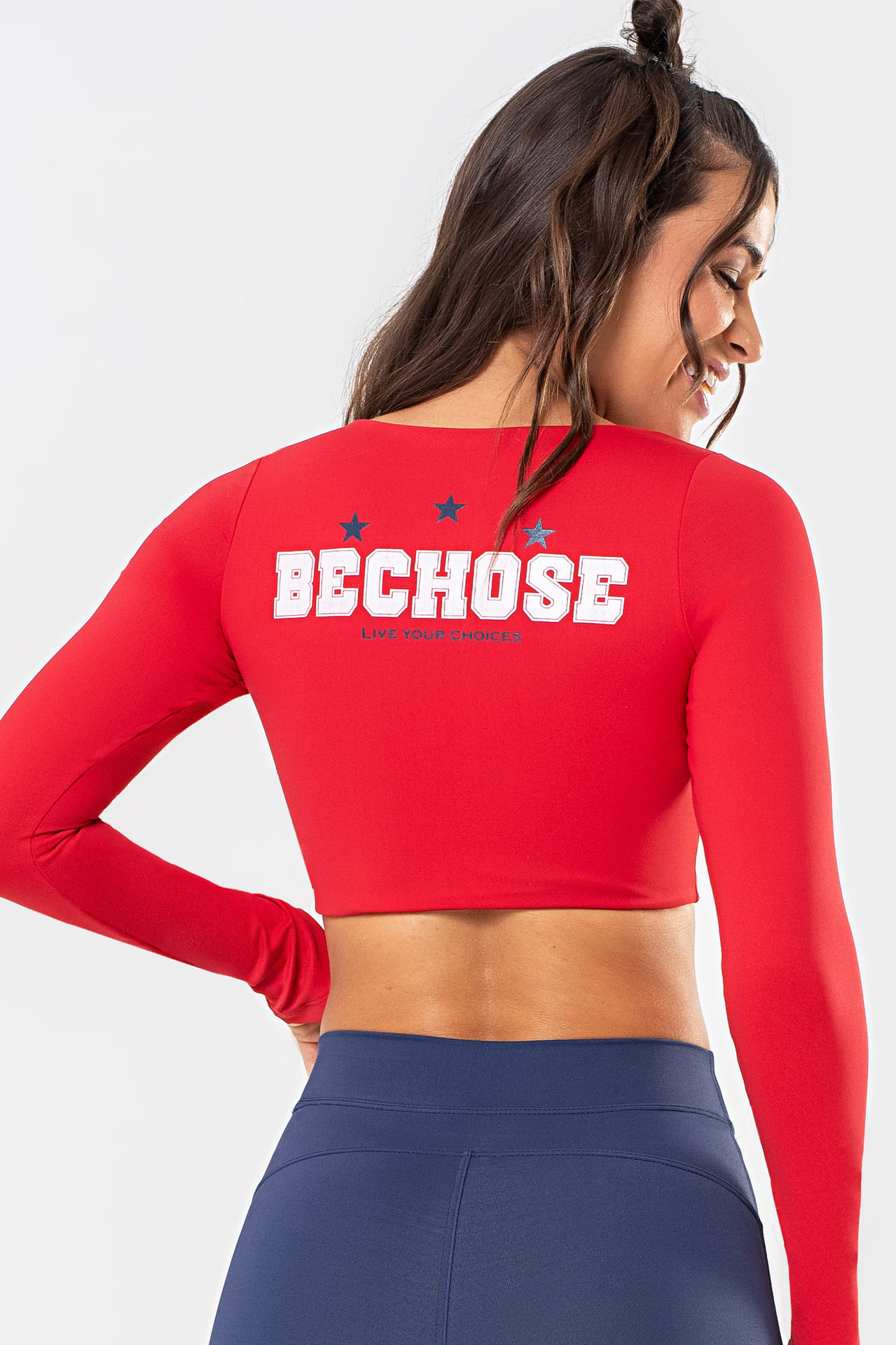 o cropped de qualidade traz toda a energia e vibração das arquibancadas americanas direto para o seu guarda-roupa. Sua tonalidade vermelha intensa simboliza paixão, força e atitude, perfeita para quem quer um visual marcante dentro e fora dos treinos.