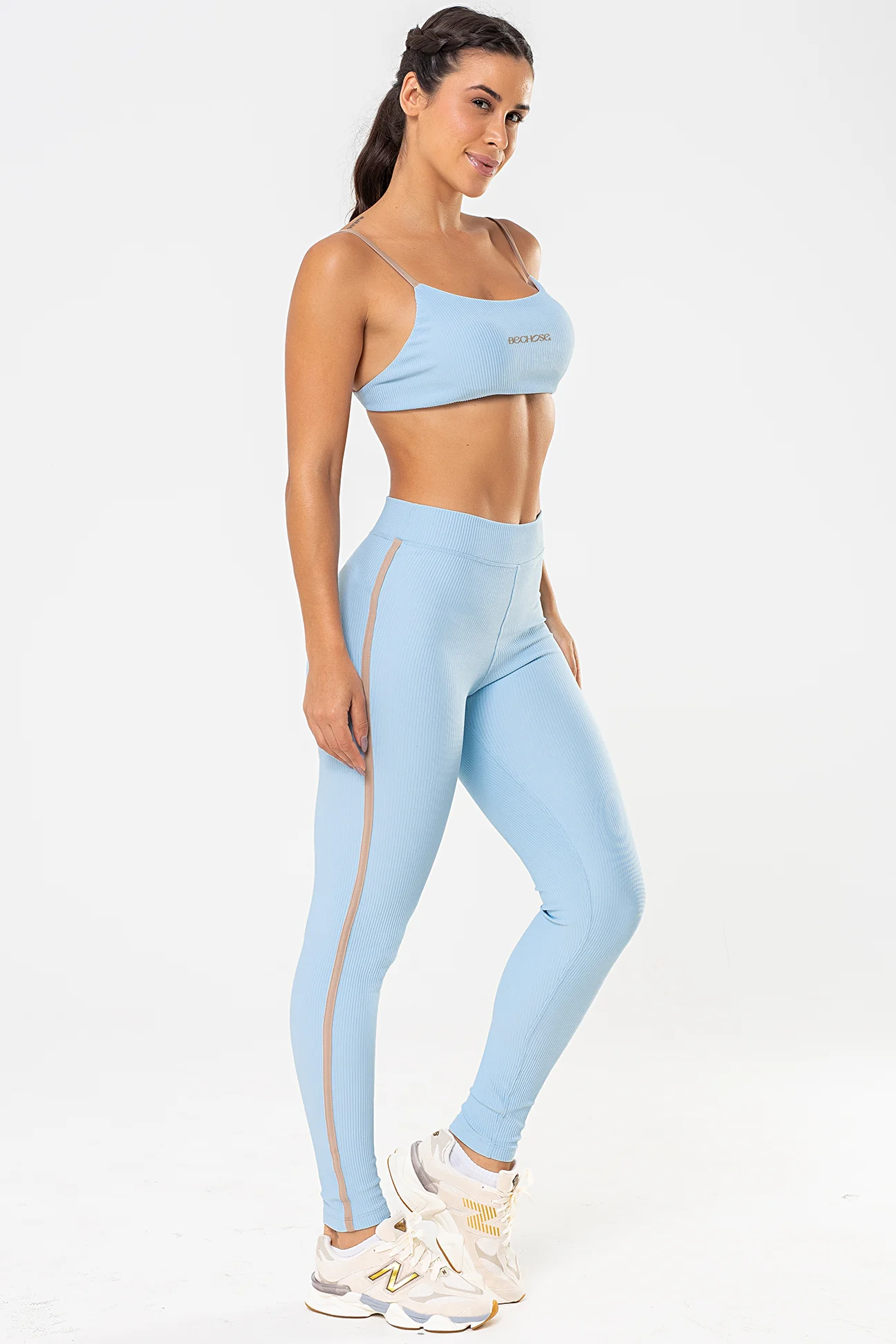 A modelagem minimalista valoriza o colo de forma elegante, acompanhando o corpo com naturalidade. O acabamento com detalhes em castanho, combinado ao tom Azul Ice, cria um visual sofisticado e atemporal, ideal tanto para looks fitness quanto athleisure.
